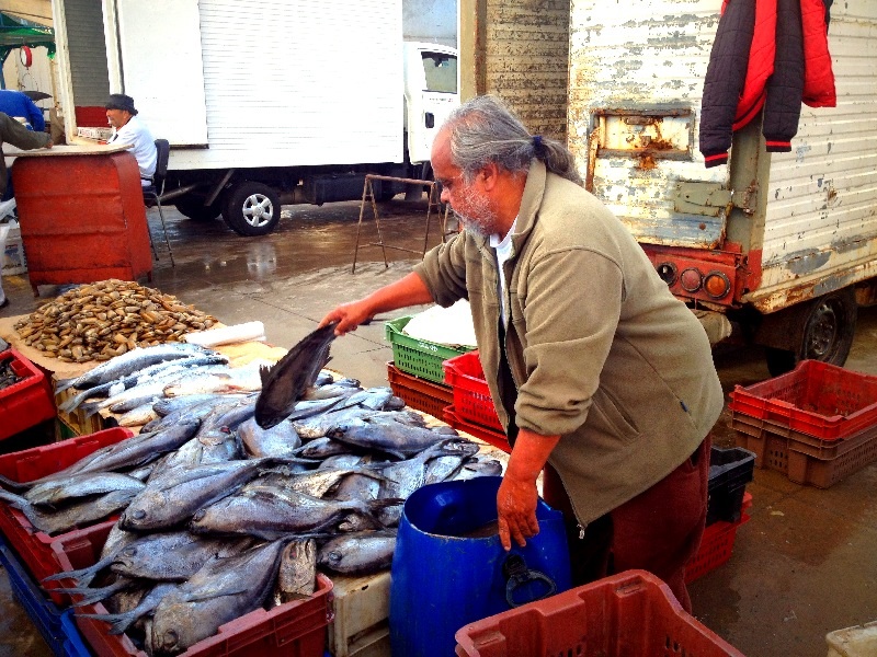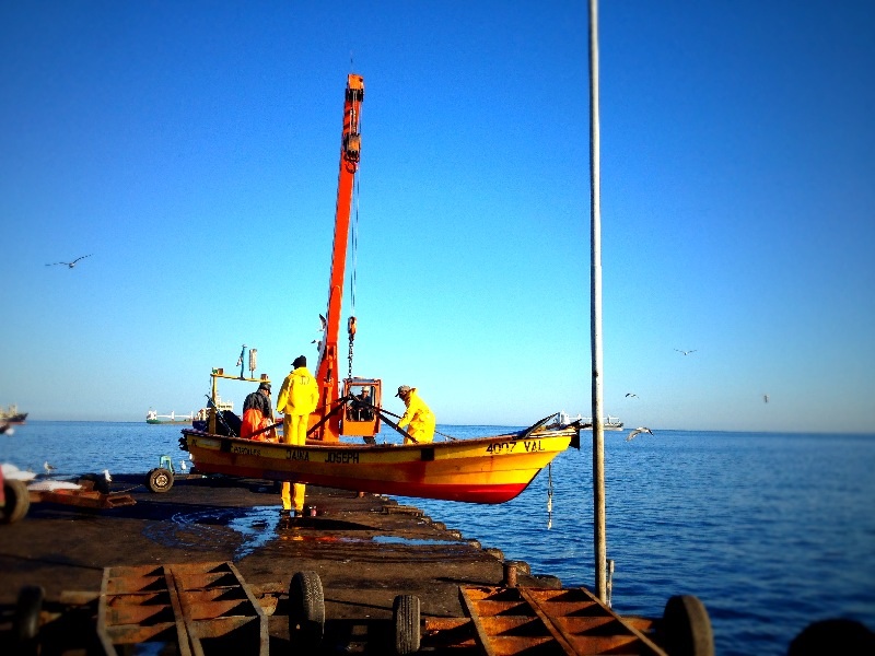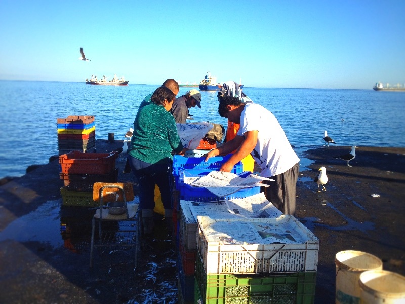 港では漁から戻った船がクレーンで上げられ、魚はすぐ塩漬けにされたり、