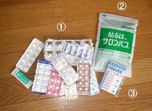① 常備薬(風邪薬、整腸剤、抗生剤、痛み止め、など)