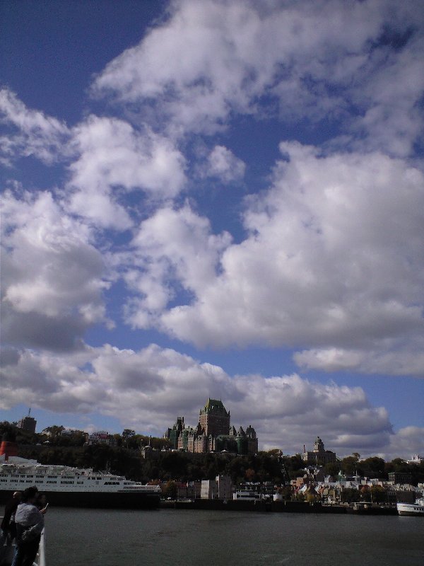 セント・ローレンス川を船で渡り、ケベックシティーを遠くから望む。
